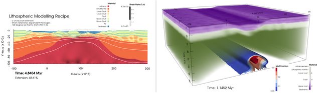 The LMR input files are setup (by default) with a 2/3D continental rifting scenario. The model includes stress and temperature dependent rheologies, partial melting, and basic threshold-style surface processes. An example of a high resolution 3D model using (almost) these inputs files can be seen here: http://youtu.be/8TxvBO2UdKg