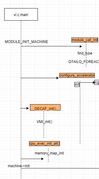 The VMI functionality is implemented through the DECAF callback binary instrumentation support; the above logic is called through a call back mechanism. DECAF supports a systematic way of registering callback for an event that we explain in detail in the Binary instrumentation page. Using this callback mechanism, DECAF registers a callback for DECAF_TLB_EXEC_CB event that translates to TLB Execute Cache Miss. The registered callback for this event is block_end_cb function that implements the above logic. VMI callback registration traces back to the initialization calls of Qemu. Qemu calls DECAF_init that in turn calls VMI_init that will call the DECAF_register_callback function to register block_end_cb for DECAF_TLB_EXEC_CB event. The trace to the DECAF_register_callback is shown in Figure 11. During execution, for x86, cpu_x86_handle_mmu_fault function handles the DECAF_TLB_EXEC_CB event and that’s where DECAF checks and calls the registered callbacks.