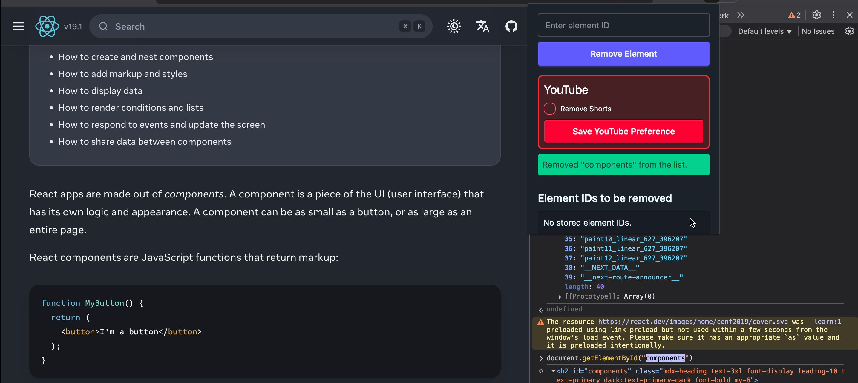 ## Overview **CleanWeb** is a lightweight browser extension that empowers users to take control of their browsing experience by removing unwanted elements from any webpage—permanently. Whether it's hiding distracting content like YouTube Shorts or blocking persistent site elements, CleanWeb gives you the tools to declutter your web. <img src="https://ik.imagekit.io/5aalo5l7bu7/Portfolio/extensionScreen_05sz9FoyR.png?updatedAt=1753641313677" /> ## Features - **Remove Any Element** Enter the element’s `id`, a description, and the domain to permanently remove it from pages you visit. - **Smart Memory** Stores your preferences using the browser's `storage.local` API. Elements stay removed even after a page reload or revisit. - **Domain-Specific Targeting** Each rule is tied to a specific domain to prevent accidental removal on unrelated websites. - **YouTube Shorts & "For You" Remover** Dedicated toggle to hide YouTube Shorts and “For You” content on load and while scrolling. - **Simple UI** Checkbox toggles, input fields, and custom remove buttons built with TailwindCSS + DaisyUI for a clean and fast user interface. --- ## Tech stack - `wxt` – Toolkit for building web extensions - `daisyui` – Tailwind component library - [`tailwindcss`](https://tailwindcss.com) – Utility-first CSS framework - `typescript` – Static type checking ## Installation (Development) ### Clone the repo: ```bash git clone https://github.com/yourusername/cleanweb-extension.git ``` ### Install dependencies: ```bash npm install ``` ### Build the extension: ```bash npm run build ``` Load it as an unpacked extension into your browser (Chrome/Edge/Firefox). ## todo - [x] Store your entity list in storage.local under a key like "entities". - [x] Load and cache the list in background.js. - [x] Listen to tab updates and send entities to content.js. - [x] remove the element from page. - [x] remove element id from List. - [x] Add test and comments for Utils - [x] Special btn for remove YT Shorts and "For you" content. - [x] modular the code. - [x] Add domain name for individual element. - [x] In content.js, match entities against the page content or URL. - [x] YT make button checkbox and remove shorts on load. - [x] remove scroll - [x] name and logo